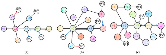 - Vertex Features: In the MGAT model, each vertex feature is represented as a vector. According to Section 2.1, this feature vector is constructed from the actual input power data of each vertex and serves as the input to the network. Specifically, the feature of vertex at time t is a vector composed of renewable generation power, main grid power, and load demand, as shown in Equation (9).