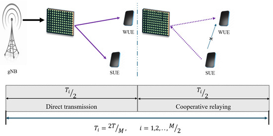 Cooperative NOMA (C-NOMA) utilizes the natural synergy within NOMA. In this approach, the SUE decodes the WUE’s data and relays them, providing signal diversity [7]. This dual-link transmission significantly enhances the performance of the WUE in the system. This results in diversity gain without requiring additional antennas, as seen in multi-input multi-output (MIMO) systems. Furthermore, cooperative relaying can effectively extend the coverage area of the gNB, ensuring more reliable and extensive communication with enhanced outage probability and throughput performance, especially for UE with poor channel conditions [8,9]. However, the SUE has to perform a retransmission to the WUE. This requires large power from the SUE, which eventually drains the SUE’s battery. During the integration of reconfigurable intelligent surfaces (RISs) during retransmission/cooperative relaying, the SUE does not require much power, and it can also reach cell-edge UE and UE at dead zones with the least power [10,11].