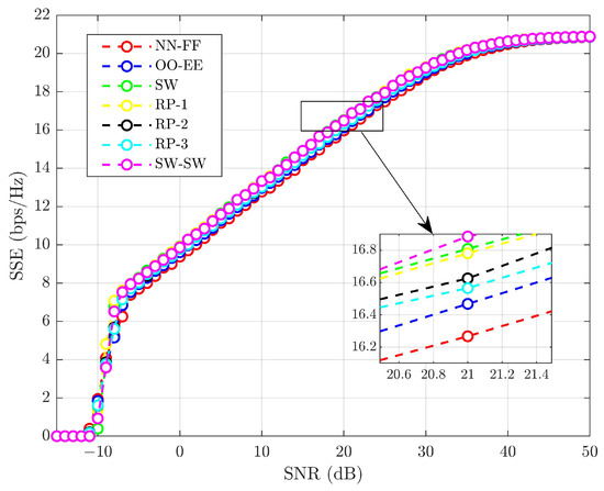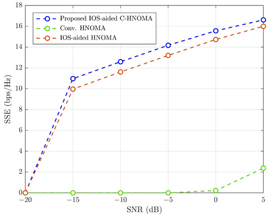 SSE (bps/Hz) comparison among the proposed IOS-aided C-HNOMA, conventional HNOMA, and IOS-aided HNOMA schemes with SW-SW pairing for and .