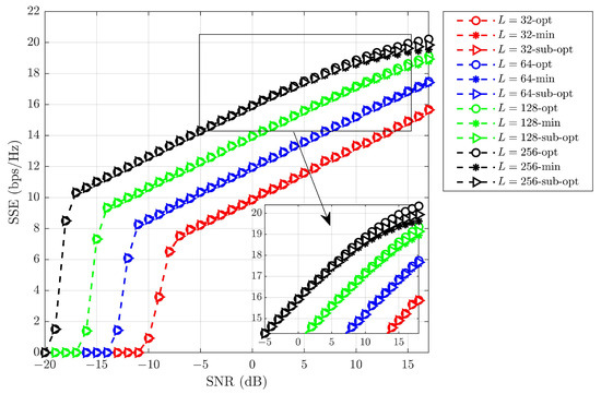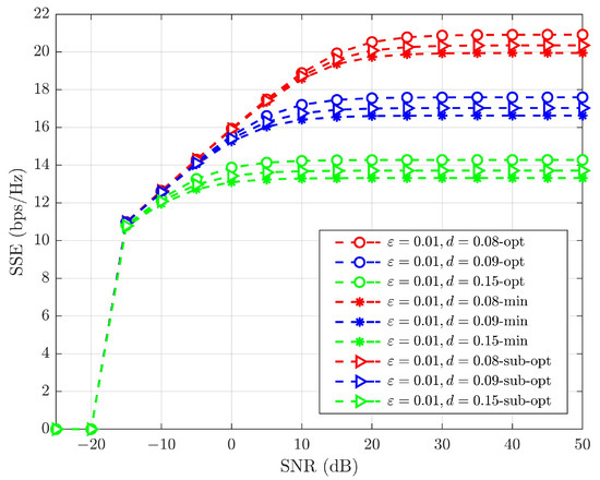 Comparison of SSE (bps/Hz) for optimal, sub-optimal, and minimum limit cases for varying at 15 dB SNR.
