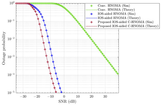 Average outage probability comparison among the proposed IOS-aided C-HNOMA, conventional HNOMA, and IOS-aided HNOMA schemes with SW-SW pairing for and .