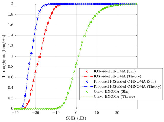 Throughput (bps/Hz) comparison among the proposed IOS-aided C-HNOMA, conventional HNOMA, and IOS-aided HNOMA schemes with SW-SW pairing for and .