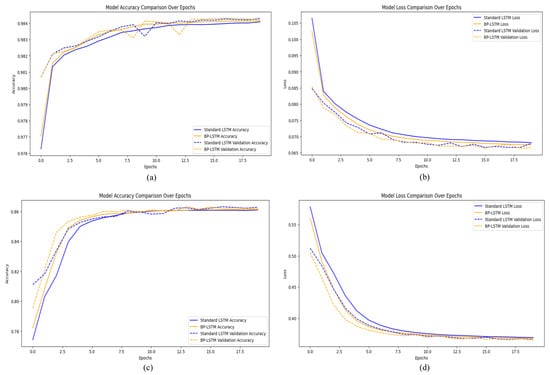 Reshaping the input data into three dimensions is an essential step in preparing it for use in an LSTM model. After normalizing, reshaping and encoding the data, we created a modified dataset that is compatible with model training. This reshaping process converts a 2D array into a 3D array, allowing the model to accurately interpret the input as sequences of observations. We trained both the LSTM and Bidirectional Peephole-LSTM (BP-LSTM) models by allocating 80% of the dataset for training. The LSTM model features a sequential architecture, beginning with a layer of 64 units that receive inputs from the reshaped and optimized features. To mitigate overfitting, we introduced a dropout layer that randomly deactivates 20% of the neurons during training. The model was compiled using the Adam optimizer with a learning rate of 0.001 and utilizes a categorical cross-entropy loss function. The training was conducted by fitting the model to the optimized training dataset over 20 epochs, with a batch size of 64. The inclusion of validation data further enhances the training process by allowing the continuous monitoring of the model’s performance. The same hyperparameter settings were applied to the BP-LSTM model, including 64 units, a single layer, a dropout rate of 0.2, a learning rate of 0.001, a batch size of 64, and 20 epochs, with the optimizer set to “Adam”.