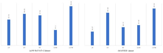 - Mughaid, A.; Alqahtani, A.; AlZu’bi, S.; Obaidat, I.; Alqura’n, R.; AlJamal, M.; AL-Marayah, R. Utilizing machine learning algorithms for effectively detection iot ddos attacks. In International Conference on Advances in Computing Research; Springer Nature: Cham, Switzerland, 2023; pp. 617–629. [Google Scholar]
