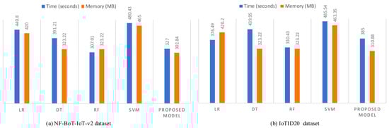 To further analyze the model, we computed the computational overhead of the hybrid feature selection method, excluding the model training and testing processes. This computational overhead comprises the sum of the time and memory usage of the three feature selection methods: SRC, MI, and FA deployed in the study. For the NF-BoT-IoT-v2 dataset, the computational time and memory usage recorded were 207.64 s and 138.56 MB, respectively. For the IoTID20 dataset, we obtained a time usage of 212.7 s and a memory consumption of 146.88 MB. The computational cost demonstrates that, while the time and memory usage are notable, they remain manageable, given the substantial improvement in feature selection accuracy. The results affirm that the hybrid feature selection method is relevant for enhancing the performance of IDS, as it effectively balances the trade-off between computational overhead and detection capabilities.