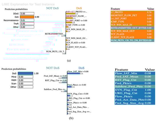 (a) LIME explanation for the NF-BoT-IoT-v2 dataset; (b) LIME explanation for the IoTID20 dataset.