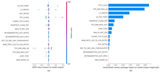 Figure 7a illustrates the 15 most influential features for detecting Denial of Service (DoS) instances within the NF-BoT-IoT-v2 dataset. Among these features, “l4_dst_port” exhibited the greatest impact, while “dns_query_id” demonstrated the least influence. The figure further indicates that an increase in the value of “tcp_flags” corresponds to a higher Shapley value, suggesting that when “tcp_flags” is elevated, the model is more inclined to classify the instance as a DoS attack. This observation implies that certain features, particularly “tcp_flags”, significantly affect the model’s prediction of DoS instances, providing valuable information that can inform both model tuning and understanding of attack characteristics.