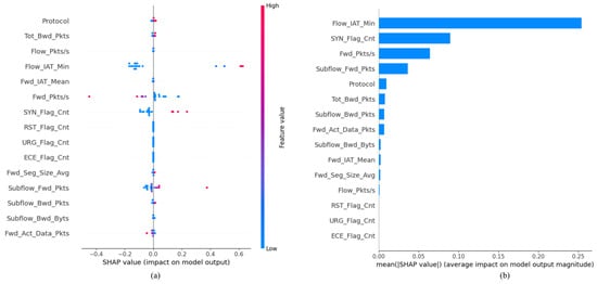 In Figure 8a, we examined the top 15 features associated with DoS instances by utilizing a different dataset. Here, “protocol” emerged as the most significant feature, while “fwd_act_data_pkts” exhibited the least impact. The model indicates that increased values of “flow_iat_min” and “syn_flag_cnt” correspond with a greater likelihood of classifying an instance as a DoS attack, as evidenced by the prevalence of red points in the plot. These findings underscore the pivotal role of specific features, namely “protocol”, “flow_iat_min”, and “syn_flag_cnt”, in the model’s decision-making process for identifying DoS attacks, suggesting that monitoring these features could significantly enhance threat detection capabilities.