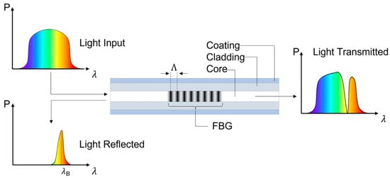 FBG sensors operate based on the Bragg diffraction principle, where specific wavelengths of light are reflected back when they interact with a grating—a periodic variation in the refractive index along the fiber core, which is illustrated in Figure 2.