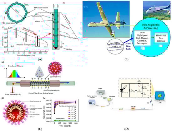 Real-world applications of FBG fiber sensors in various engineering fields. (A) FBG application in slope structures: (a) cross-section; (b) longitudinal section; (c) diagram of installation []. (B) FBG application in aerospace engineering []. (C) FBG application in biomedical engineering: (a) Schematic diagram of the sensing mechanism of FBG; (b) Schematic diagram of COVID-19; (c) Wavelength of detected light versus exposure time for various virus concentrations []. (D) FBG application in energy systems [].