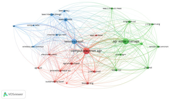 The bibliometric analysis of the most cited journals in IoT-based smart irrigation (Figure 5) research reveals three clusters with a strong interdisciplinary connection between agriculture, water management, sensor technology, and IoT applications. The journal Computer Electronics and Agriculture stands out as the most influential source, with 388 citations and the highest total link strength of 8184, indicating its central role in disseminating research at the intersection of IoT and agricultural automation. Similarly, Agriculture Water Management (266 citations, 6035 link strength) underscores the critical role of water-use efficiency studies in smart irrigation systems. The prominence of Sensors—Basel (214 citations, 4980 link strength) highlights the growing focus on sensor technologies for precision agriculture and irrigation control. The presence of IEEE Access (110 citations) and IEEE Internet of Things (64 citations) in the top-ranking journals demonstrates the integration of advanced IoT frameworks, networking protocols, and real-time data analytics in irrigation research.