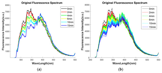 Original spectral analysis: (a) fluorescence spectra at different fault times; (b) all original fluorescence spectral data.
