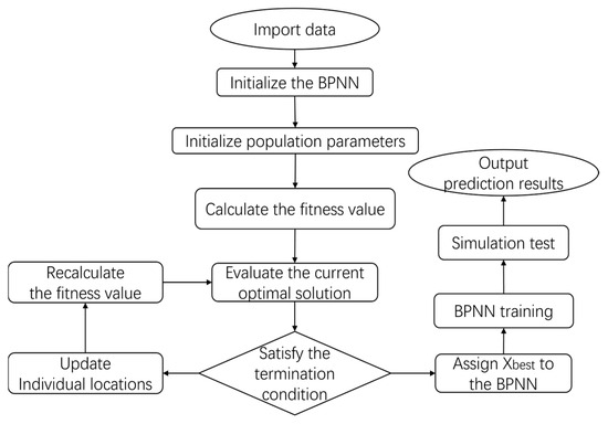 In the training process, the BPNN gradually looks for the optimal parameters, such as the connection weight and threshold, through error backpropagation, but it is likely to fall into the local optimum, which will affect the final effect of the network. Moreover, the initialized network parameters are random and the initial value has a great impact on the network performance. Therefore, this study uses the intelligent optimization algorithm to optimize the weight and threshold parameters of the network model, so as to obtain a better model failure prediction effect.