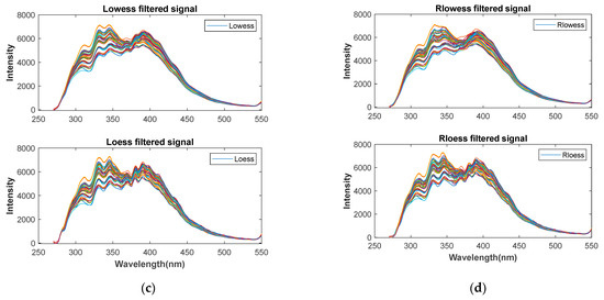 Preprocessed images. (a) SG and Gaussian filtered signals; (b) moving median and moving mean filtered signals; (c) Lowess and Loess filtered signals; (d) Rlowess and Rloess filtered signals.
