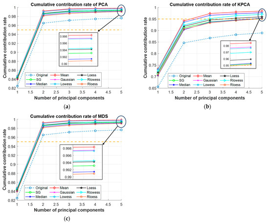 Figure 7 shows the number of principal components and the corresponding cumulative contributions of the data under various preprocessing steps. When there is one principal component, the cumulative contribution of all models does not reach 85%, and then the cumulative contribution rate gradually increases with the increase in the number of selected principal components. Taking KPCA dimensionality reduction as an example, when there is one principal component, the cumulative contribution rate of the Mean-KPCA model is the highest, reaching 73.3159%, and the other models are lower than this. The cumulative contribution rates of all preprocessed models are higher than those of the original data; the cumulative contribution rate of the Original-KPCA is the lowest, only 65.6076%. When the number of principal components increases to 5, the cumulative contribution gradually stabilizes, and the cumulative contribution of all data preprocessed models are higher than 95%. At this time, the cumulative contribution of Mean-KPCA is still the highest, which is 98.4293%; the lowest is Rloess-KPCA, which is 95.1081%; and the cumulative contribution rate of untreated Original-KPCA is only 88.9571%. So, the number of principal components is selected as 5 for subsequent modeling and identification.