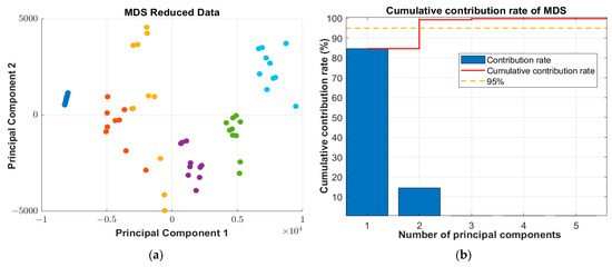 (a) First and second component scores after MDS dimensionality reduction; (b) cumulative contribution rate after MDS dimensionality reduction.