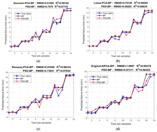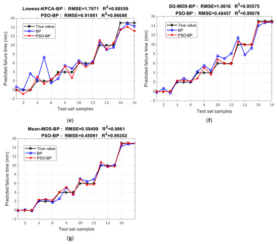 Then, the BP neural network model is established to fit the transformer failure time, and the data visualization and model evaluation parameters are compared, so as to find the most suitable smooth preprocessing and feature extraction methods. The prediction results of each model test set are recorded in Table 4, and the one with the best effect is SG-PCA-BP with an R2 of 99.411% and RMSE of 0.38728 under the same PCA dimensionality reduction method. The worst model is the Rlowess-PCA-BP with an R2 value of 96.234% and RMSE of 0.97948. The Gaussian-KPCA-BP pretreatment model has the best effect under the same KPCA method, with an R2 of 97.799% and RMSE of 0.74868. The worst effect model is Lowess-KPCA-BP with an R2 of 88.559% and RMSE of 1.7071. The best model under MDS reduction is Rlowess-MDS-BP with an R2 of 98.633% and RMSE of 0.59011, while the worst is the SG-MDS-BP model with an R2 of 95.575% and RMSE of 1.0616. The model’s prediction value fluctuates up and down the real value, the overall error fluctuation is large, and the regression effect of the model needs to be enhanced.