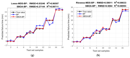 The transformer failure detection model based on the SBOA optimized BPNN is established to quantitatively analyze the state of insulating oil. The prediction results of the following neural network models established under different preprocessing dimension reduction methods are improved greatly to varying degrees after SBOA optimization compared with those before optimization. The comparison of the prediction results before and after optimization is shown in Figure 10, and the performance indicators of each model are shown in the Table 6. Among them, the Loess-MDS-SBOA-BP model has the best performance: R2 is increased to 99.711%, the RMSE is reduced to 0.27144, and the other evaluation indexes are also the best, and the predicted failure time is the closest to the true value. Compared with the best Mean-MDS-PSO-BP model after POS optimization, this model has a higher determination coefficient and a better regression fitting effect, compared to the untreated Original-BP, whose R2 is only 70.477% and RMSE is 2.7423, which maximizes the prediction ability. The RMSE is reduced to 1/10, as shown in Figure 11.