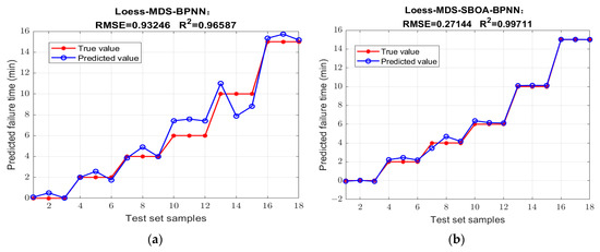 Comparison of the best Loess-MDS-SBOA-BP model before and after optimization. (a) Lo-ess-MDS-BPNN; (b) Loess-MDS-SBOA-BPNN.