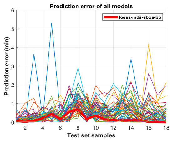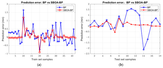 The prediction error curves of all models are shown in Figure 12. In general, the errors of samples 2–6 and 14–16 fluctuate greatly, while in the remainder of the samples, the errors deviate from the true value slightly. Compared with the BP fault diagnosis model, the error fluctuation between the predicted value and the real value of the optimized SBOA-BP failure detection model is small, and the regression prediction effect of the model is greatly improved. Among them, the Loess-MDS-SBOA-BP model still has the smallest fluctuation in the error curve; the error curves of the training set and the test set before and after optimization are shown in Figure 13. The experimental results show that the Loess-MDS-SBOA-BP model is the best model suitable for the quantitative diagnosis of early faults in the transformer, which can provide an accurate diagnosis of the fault time and provide a basis for the further development of the domain of transformer failure diagnosis.