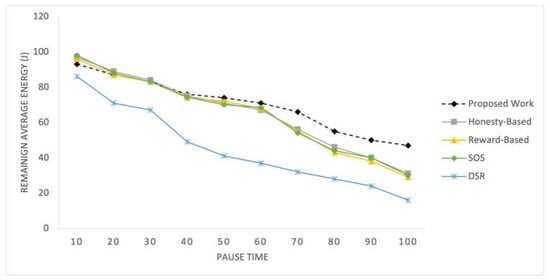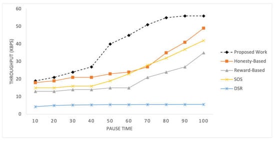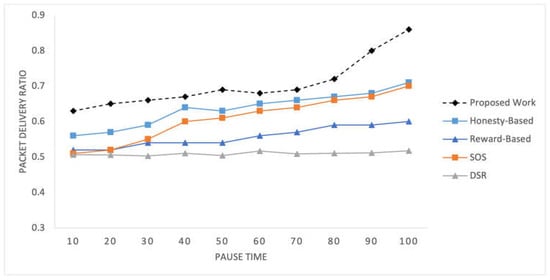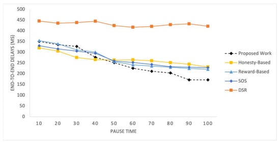 In these figures, it is observed that the end-to-end delays for the proposed work are slightly higher than those for the other mechanisms initially. However, as time progresses, the delays for the proposed mechanism start to decrease and eventually become lower than those for the honesty-based mechanism. In the beginning, the data quality values may not have enough influence on the performance due to the limited traffic records. However, as more traffic flows are observed after a time pause of 40, the delays considerably decrease. The delays peak at a time pause of 90. The DSR exhibits poor performance due to the absence of selfish node management. Conversely, the other mechanisms exhibit a uniform decline in their delays, ultimately resulting in higher values than those of our proposed mechanism.