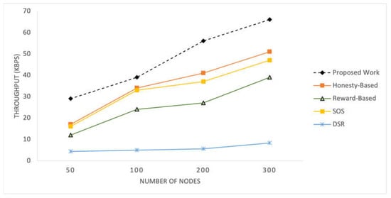 With an increase in the number of nodes, all the mechanisms obtain a higher throughput. These mechanisms are highly dependent on the number of nodes because the primary parameters used are related to the number of nodes. With an increased number of nodes, these mechanisms achieve a higher throughput. These mechanisms are highly dependent on the number of nodes because the primary parameters used are associated with the number of nodes. As the network size increases, there are more opportunities for nodes to establish connections and select efficient relay nodes, resulting in improved throughput.