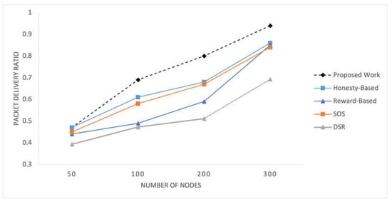 The social preferences, transmission history, and quality data delivery utilized in the proposed mechanism exert a significant influence the PDR results. As time progresses, nodes can establish better routes, resulting in a consistent increase in the PDR values over different time intervals. Additionally, the number of nodes in the network also influences the PDR, as demonstrated in Figure 9. With a larger number of nodes, more potential routes and relay options are available, leading to variations in the PDR values across different network configurations. The proposed mechanism outperforms this experiment due to the better utilization of social parameters and traffic-associated factors.