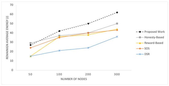The network area considered is 1000 × 1000 m2. The highest level of energies and buffer sizes are set to 100 J and 100 bytes. The f is kept random for all the nodes. The nodes are also programmed to change this value according to their history of data transmission, proximity, and resource levels. Moreover, 25% of the nodes have lower values for f. In the case of a reward-based mechanism, the value is kept random to exhibit the random selfishness levels. However, 25% of the nodes are kept selfish by setting at a lower value. In the case of honesty-based and SOS mechanisms, 25% of nodes are kept with selfishness levels. In the case of DSR, 25% of the nodes do not provide relaying services to other nodes. They demonstrate a simple refusal to participate in routine tasks. As the baseline DSR lacks a dedicated mechanism to handle such behaviors, the network performance significantly degrades.