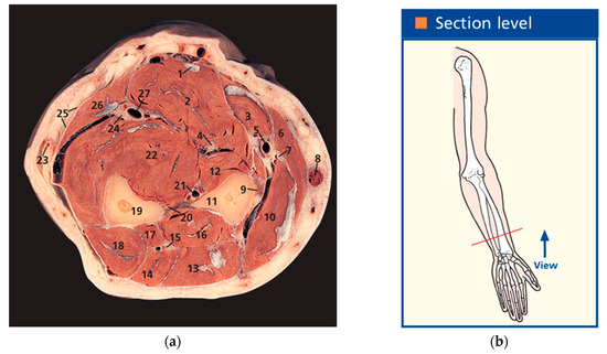 Muscles under study position in the anatomical atlas (left forearm, axial section, male): anatomical illustration (a) (10—mm. extensors carpi radiales longus et brevis; 11—radius; 13—m. extensor digitorum; 14—m. extensor digiti minimi; 18—m. extensor carpi ulnaris; 19—ulna; 6—m. brachioradialis; (b) anatomical illustration cutting level [39].