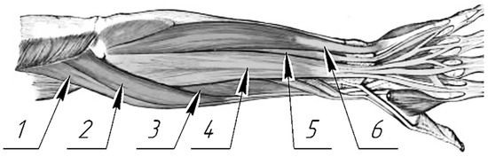 The m. extensor carpi ulnaris (6 in Figure 3) is positioned directly under the skin and is adjacent to the ulna dorsal surface. It originates in the humerus lateral epicondyle from the forearm lateral radial ligament and fascia. It is attached to the fifth metacarpal bone base. The m. extensor digiti minimi (5 in Figure 3) is positioned on the forearm dorsal surface between the extensor carpi ulnaris and the extensor digitorum. It originates from the humerus lateral epicondyle and is attached to dorsal aponeurosis of the fifth finger. The m. extensor digitorum (4 in Figure 3) is positioned on the forearm dorsal surface immediately under the skin and lateral to the m. extensor carpi ulnaris. It originates from the humerus lateral epicondyle and from the radius lateral and annular ligaments. Four tendons from the muscle pass under the flexor retinaculum and split into three tendinous legs at the proximal phalanges, one of which is attached to the middle phalanx and the two lateral ones to the distal phalanx base. The m. extensors carpi radiales longus (2 in Figure 3) is positioned directly under the skin on the forearm dorsolateral surface behind the brachioradialis muscle in the lower third under the abductor longus muscle and the short extensor of the 1st finger. It originates from the lateral edge of the external supramuscular septum and the humerus lateral epicondyle. It is attached to the second metacarpal bone base. The m. extensors carpi radiales brevis (3 in Figure 3) is positioned directly under the skin, is adjacent to the ulna dorsal surface, and originates in the humerus lateral epicondyle from the lateral radial ligament and the forearm fascia. It is attached to the fifth metacarpal bone base. The m. brachioradialis (1 in Figure 3) is positioned directly under the skin, a bit more lateral among the thumb muscles. It originates from the flexor retinaculum and the scaphoid bone and is attached to the outer side of the thumb proximal phalanx and the outer, i.e., sesamoid, bone.