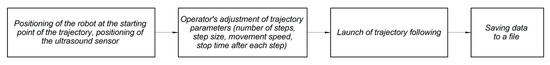 Before starting the study, the forearm was manually ultrasound scanned to determine the boundaries of the muscles in action. During the study, the volunteer’s forearm was positioned in a special cradle of the laboratory system (parallel to the ultrasound sensor surface and motion axis) to exclude the influence of a table on the forearm tissues’ morphology. Additionally, to level out deformations in the forearm tissues’ internal structure from the ultrasound sensor and to ensure stable contact between the sensor and the object, a cushion of ultrasound gel (relatively increased volume) was applied to the skin surface. In turn, the robotic system allowed for positioning and displacing the ultrasound sensor fixed in the manipulator adapter along the X-, Y-, and Z-coordinates with the given motion speed and step without affecting internal anatomy in the research area. Ultrasound images of forearm soft tissues were acquired in an automated mode using a robotic system that moved the ultrasound transducer along a predefined trajectory with control of the pressing force. The process of trajectory compilation consisted of the following steps: positioning of the robotic manipulator to the initial point of the trajectory, alignment of the ultrasound transducer to the position at which visualization of the target muscle is achieved, setting trajectory parameters by the operator (number of steps, step size, speed of movement, stopping time after each step), launch of trajectory following, and saving the data containing the robot coordinates relative to the initial position and pressing force of the ultrasound sensor at each step of the trajectory to a file (Figure 4).