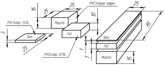 The phantom consisted of two parts. In the first part, plates simulating the skin, subcutaneous fat, and muscles in terms of the acoustic properties were arranged in layers at a distance of 1–2 mm. The plates had a predetermined rectangular shape and dimensions. In the other part of the phantom, the soft tissue models of a cubic shape were also spaced with predetermined dimensions (Figure 9).