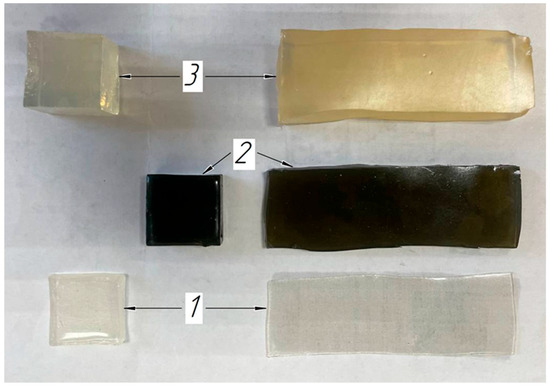 PVC-plastisol with various types of impurities was used as a material in creating the phantom to achieve different levels of echogenicity on the ultrasound diagnostics system screen [42]. Muscle and skin tissue imitation was simulated with a material having a hardness of 3 on the Shore A scale, and subcutaneous fat imitation was simulated with a material having a hardness of 6 on the Shore A scale. In turn, the muscle edges had a hyperechogenic structure to imitate the fascia. In simulating the subcutaneous fat to increase the echogenicity, graphite powder 0.1% was used as the impurity. The skin was simulated with a material having a hardness of 6 on the Shore A scale. To simulate the skin acoustic properties (hyperechogenic), aluminum powder 1.5% with a particle diameter of 0.1 mm was used as the impurity (Figure 8). Increased echogenicity was achieved by adding graphite powder. Anechoicity was achieved by refusing to use any impurities.