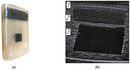 Soft tissue phantom: (a) phantom appearance after removal from the casting mold; (b) transverse ultrasound image of the phantom layers simulating acoustic properties of the forearm soft tissues: 1—skin layer imitation, 2—subcutaneous fat layer imitation, 3—muscle layer imitation.