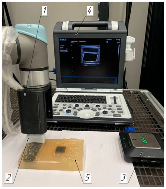 Components of the laboratory system: 1—collaborative 6-degree robotic manipulator; 2—video capture card; 3—personal computer; 4—digital ultrasound diagnostic system; 5—ultrasound sensor.