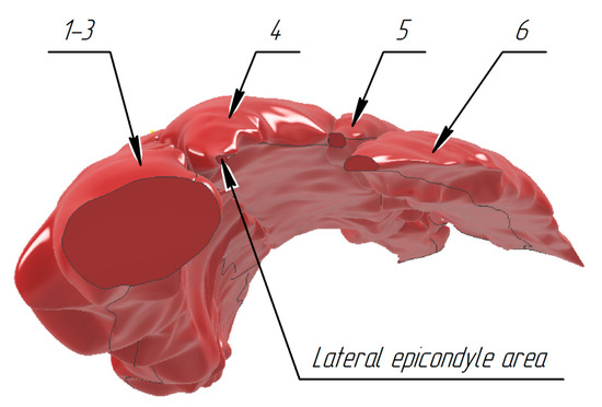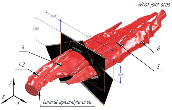 Reconstructed volumetric models of the forearm tissues in static contraction (bottom view): 1–3—m. brachioradialis, m. extensors carpi radiales longus, m. extensors carpi radiales brevis, 4—m. extensor digitorum, 5—m. extensor digiti minimi, 6—m. extensor carpi ulnaris.
