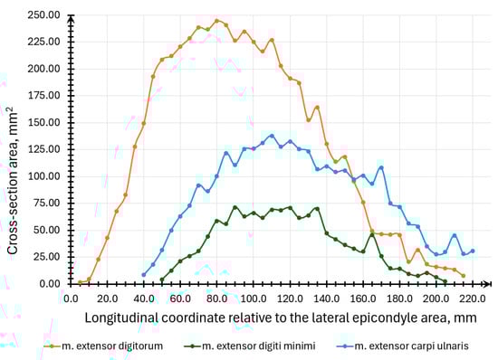Graphical representation of the m. extensor digitorum, m. extensor digiti minimi, and m. extensor carpi ulnaris muscles cross-section area dependence on the longitudinal coordinate value relative to the lateral epicondyle area.