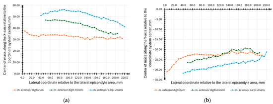 Dependences of the m. extensor digitorum, m. extensor digiti minimi, and m. extensor carpi ulnaris muscle sections’ center of mass coordinates on the longitudinal coordinate value relative to the lateral epicondyle area: (a) along the X-axis; (b) along the Y-axis.