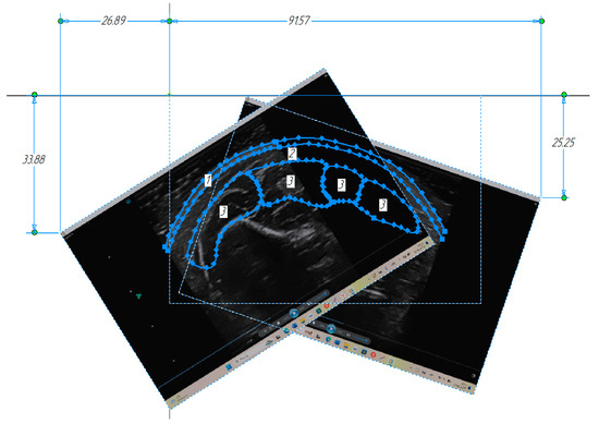 The ultrasound image corresponding to the sensor position at an angle of 45 degrees relative to the vertical was located at an angle of 19 degrees relative to the vertical and with the characteristic point coordinate (26.899; 33.883). The ultrasound image corresponding to the sensor position at an angle of 354 degrees was located at an angle of 32 degrees and with the characteristic point coordinate (91.57; 25.25). Then, each ultrasound section image was located in the automated design system with the given angle and characteristic point coordinate. In each section, the muscles under study were contoured (Figure 12).