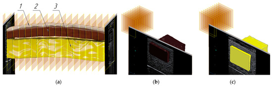 Reconstructed volumetric models of the phantom layers simulating the forearm soft tissues by the acoustic properties: (a) layers arrangement one under another: 1—skin imitation layer, 2—subcutaneous fat imitation layer, 3—muscle imitation layer; (b) subcutaneous fat imitation layer; (c) muscle imitation layer.