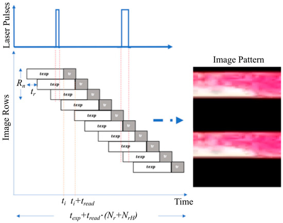 Next, the dazzling effect formed in the attacked image is examined. With a rolling shutter camera, every row in the frame collects ambient light during different periods. As shown in Figure 3, the -th row of the sensor records the light integrated during the period from till , while for the following row , the integration time will be until , where denotes the reading time of a single row and denotes the exposure time of a single row. The duration of scanning each frame, denoted by , can be expressed as follows [16]: