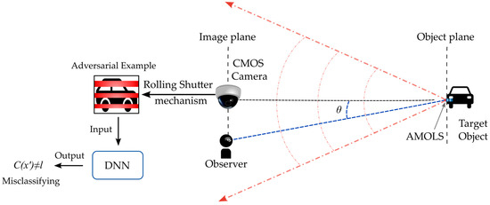 This section focuses on determining the photometric conditions required to keep the AMOLS effectively invisible. The attack scenario is depicted in Figure 5, where a target object (car) and the AMOLS are placed in front of a camera while an observer is near the camera at an angle relative to the optical axis. The acquired image is then fed to DNN to classify the target. Consider that the AMOLS power is set to produce an irradiance of at the sensor plane when active. The average power received by the observer’s eyes from the AMOLS is influenced by the duty cycle of the AMOLS during the frame exposure period. The light source duty cycle denoted by determines the average power of the light source, which can be expressed as . In addition, assuming the AMOLS is smaller than the human eye’s angular resolution, the strictest condition would be the concentration of the seen power from any given source. Thus, a larger angular extent covered by the AMOLS would yield a lower peak power.