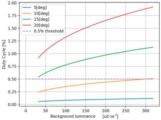 Figure 6 shows the light source duty cycle required for dazzling as a function of the background illumination for various viewing aspect angles. As the aspect angle increases, the effective radiance on the retina decreases. Consequently, the contrast decreases with the increasing background brightness, requiring more power to exceed the threshold. It is observed from the results shown in Figure 6 that for observers placed at an angle greater than 10 degrees, a duty cycle of is sufficient to keep the source invisible, regardless of the background illumination level. The following sections will present a technique that can be operated even at lower duty cycle percentages.