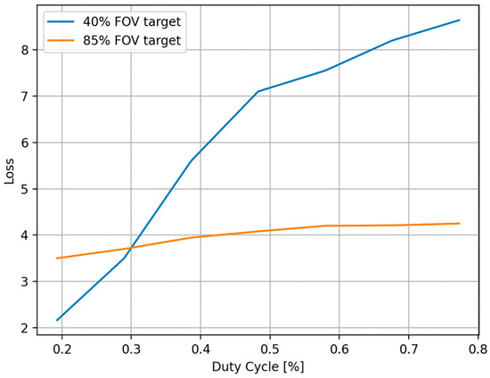 We evaluate the effectiveness of the AMOLS based on the duty cycle of a pulsed laser (as discussed in Section 3.2) while keeping a constant pulse width. The ResNet50 classifier [37] and the standard cross-entropy loss function are utilized to simulate the adversarial attacks on the image classification model. Figure 7 shows simulation results of the loss function depending on the AMOLS duty cycle for two cases: where an object covers (1) approximately of the field of view (FOV), and (2) approximately of the FOV. These results focus on the “Coffee mug” as the target object, with the highest obtained values for each examined duty cycle as a result of optimizing the attack (as discussed in Section 3.3). It can be empirically determined that loss function values exceeding 2 exhibit poor classifier performances, resulting in misclassification across a significant number of input images—specifically, this enhances the effectiveness of the AMOLS. The results presented in Figure 7 indicate that when the duty cycle is set lower than , the attack remains feasible—yet the classification model tends to yield better results when the target object covers of the FOV. Conversely, increasing the AMOLS duty cycle substantially raises the loss, thereby enhancing the effectiveness of the attack in the case of an object occupying of the FOV. Additionally, for a target object that covers of the FOV, the attack proves effective across the entire duty cycle range examined, with a milder dependence on changes in the AMOLS duty cycle.