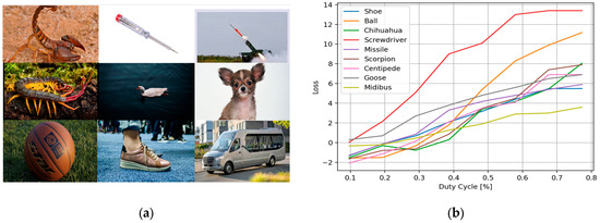 In addition, we examined a range of target objects during the attack, imaged from various angles of view corresponding to different classes—several samples are shown in Figure 8a. An analysis of the effect of the AMOLS duty cycle, while maintaining constant pulse width, on the classifier’s loss function across diverse input images is shown in Figure 8b. We empirically found the critical values of the cross-entropy loss function at which the DNN begins to misclassify objects across different classes, considering an offset in the obtained loss curves above these critical values. It is observed from the results shown in Figure 8b that an AMOLS duty cycle of , which corresponds to a designed sequence of 4 laser pulses, successfully fools the classifier in all cases.