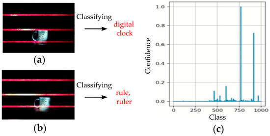 Figure 9a,b shows two optical-based physical adversarial examples and their corresponding predictions from the image classification model. These examples were generated from two separate exposure shots, where the AMOLS used different pulse widths. It is worth mentioning that the attacking light pulse sequence is not synchronized with the camera’s exposure moment (see Section 3.3), leading to variations in the dazzle pattern across each frame, specifically introducing a horizontal shift. Videos showing the footage from the attacked camera sequence are provided in the Supplementary Materials. Additional examples can be found on the GitHub repository associated with this paper at https://github.com/ZviSteinOpt/RollingShutterAttack/tree/main (accessed on 1 April 2025). The invisible CMOS camera dazzling attack induces misclassification across the input images, significantly reducing the classifier’s confidence in the correct 500th class, as shown in Figure 9c.