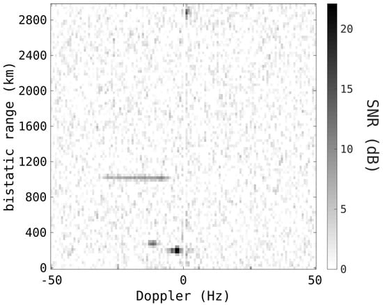 Figure 3 is a typical example of an HFLOS radar range–Doppler map, formed with a CIT of 1.28 s. Apparent in the range–Doppler map is a satellite moving through Doppler at an approximately 1000 km range (the satellite’s Doppler spans approximately 20 Hz). Also present are some strong meteor returns at low range. The direct wave from the transmitter has been nulled by using a Doppler notch at 0 Hz. There are also some potential skywave returns at 2800 km.