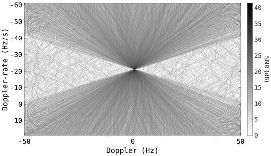 Figure 4 is the chirpogram of the radar returns from the same satellite as in Figure 3. The slow-time returns from the satellite’s range bin have been processed with a large span of Doppler-rate hypotheses. A 5.12 s CIT was used so that the satellite spans the whole Doppler extent when uncompensated, i.e., Doppler rate = 0 Hz/s. At the correct Doppler rate, where the SNR is maximised, the Doppler-walk is completely mitigated and the slow-time signal is focused to a single Doppler bin, providing a significant increase in sensitivity as well as better localising the target.