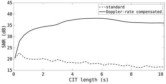 The SNR of an example RSO against CIT length for standard processing as well as Doppler-walk mitigation.