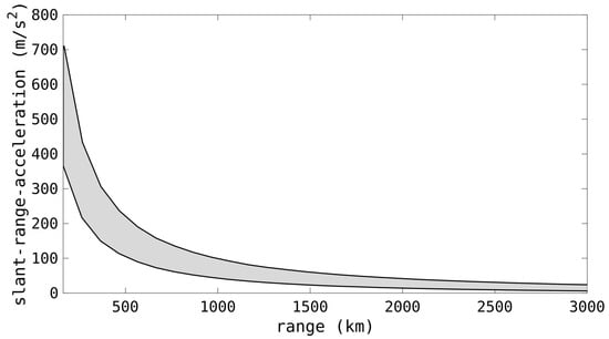 For all potential RSOs, there is an incredibly large overall span of Doppler rates that would need to be searched. However, for a single point in space, for an Earth-centered orbit, this span is considerably reduced [61]. Figure 6 shows the span of valid slant-range accelerations for a zenith beam from a monostatic radar. Although it spans from near-zero through to over 700 m/, for a specific range bin the span is quite limited. This can improve processing by reducing the number of Doppler-rate hypotheses to only match for valid orbits. Prior to operation, a radar could determine the valid Doppler-rate span for each beam to reduce processing load whilst still matching every potential Earth-centered orbit.